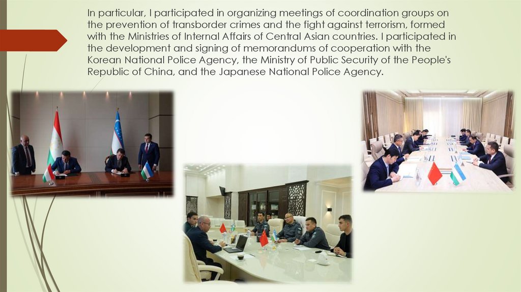 In particular, I participated in organizing meetings of coordination groups onthe prevention of transborder crimes and the fight against terrorism, formed