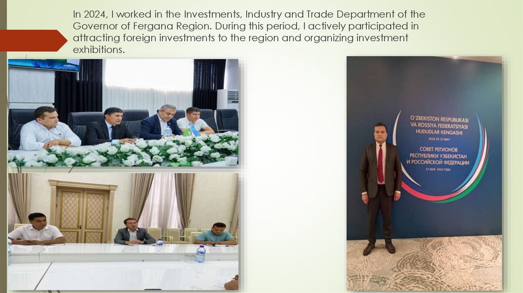 In 2024, I worked in the Investments, Industry and Trade Department of theGovernor of Fergana Region. During this period, I actively participated in