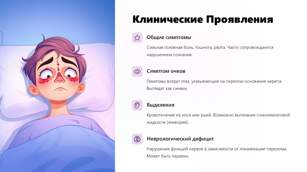 Кровотечение из носа или ушей. Возможно вытекание спинномозговой