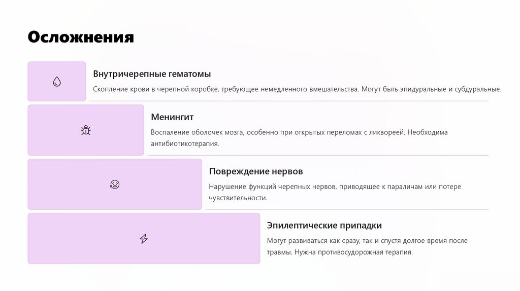 Воспаление оболочек мозга, особенно при открытых переломах с ликвореей. Необходима