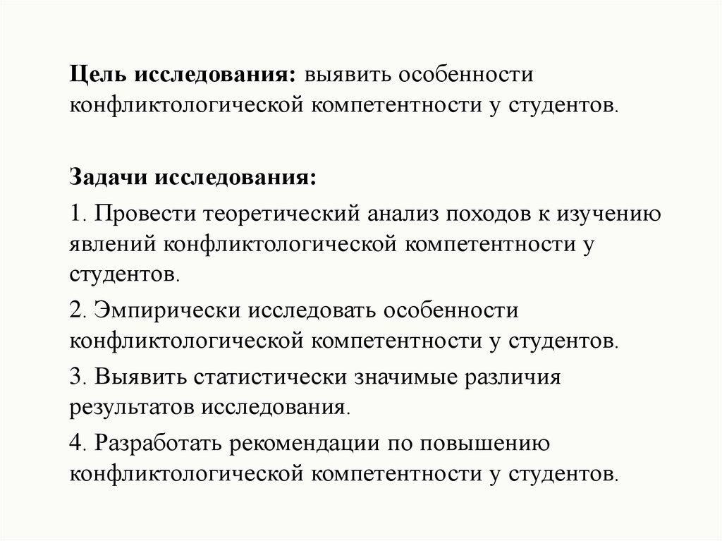 Цель исследования: выявить особенностиконфликтологической компетентности у студентов.