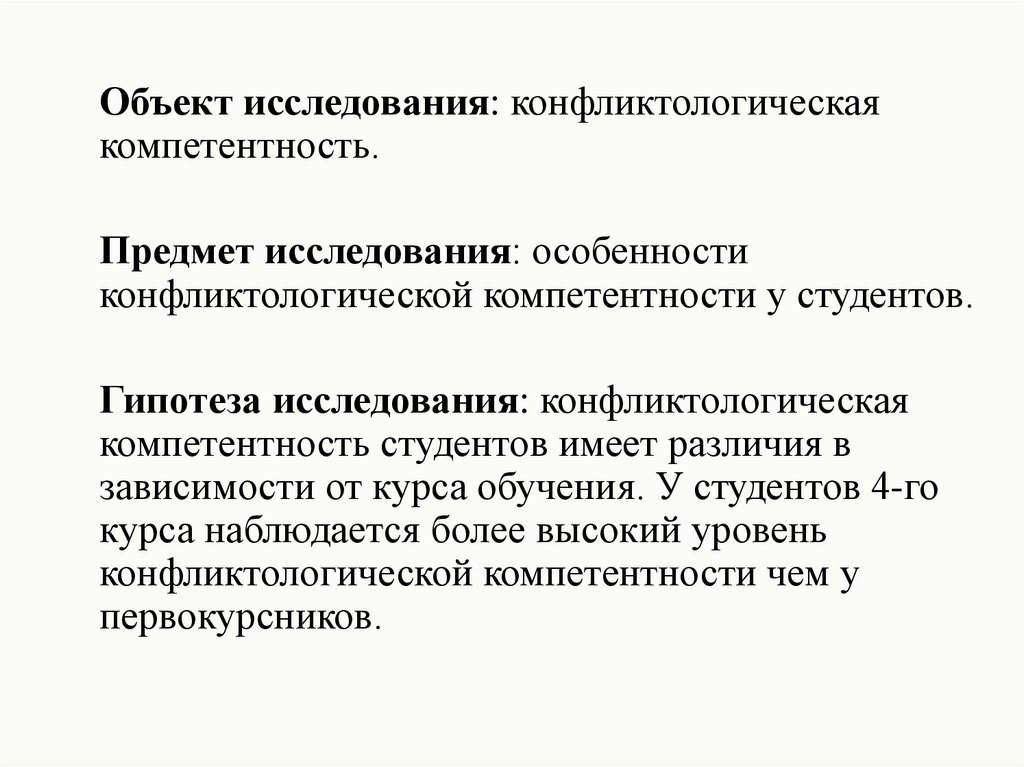 Объект исследования: конфликтологическаякомпетентность.
