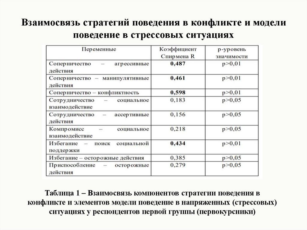 Таблица 1 – Взаимосвязь компонентов стратегии поведения вконфликте и элементов модели поведение в напряженных (стрессовых)
