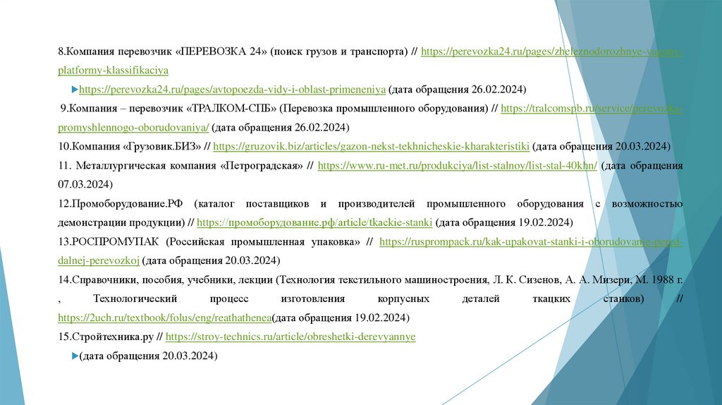 8.Компания перевозчик «ПЕРЕВОЗКА 24» (поиск грузов и транспорта) // https://perevozka24.ru/pages/zheleznodorozhnye-vagonyplatformy-klassifikaciyahttps://perevozka24.ru/pages/avtopoezda-vidy-i-oblast-primeneniya (дата обращения 26.02.2024)