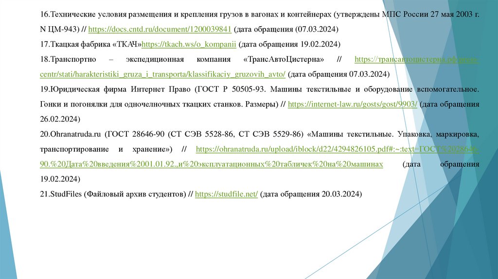 16.Технические условия размещения и крепления грузов в вагонах и контейнерах (утверждены МПС России 27 мая 2003 г.N ЦМ-943) // https://docs.cntd.ru/document/1200039841 (дата обращения (07.03.2024)