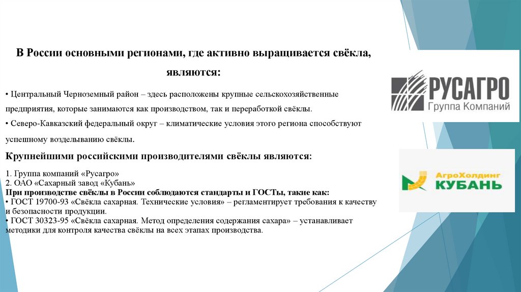 При производстве свёклы в России соблюдаются стандарты и ГОСТы, такие как: