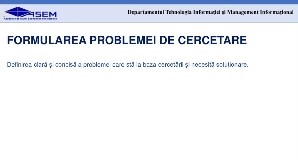 FORMULAREA PROBLEMEI DE CERCETAREDefinirea clară și concisă a problemei care stă la baza cercetării și necesită soluționare.