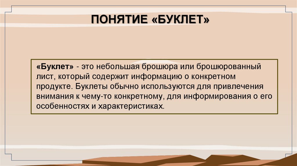 ПОНЯТИЕ «БУКЛЕТ»«Буклет» - это небольшая брошюра или брошюрованный
