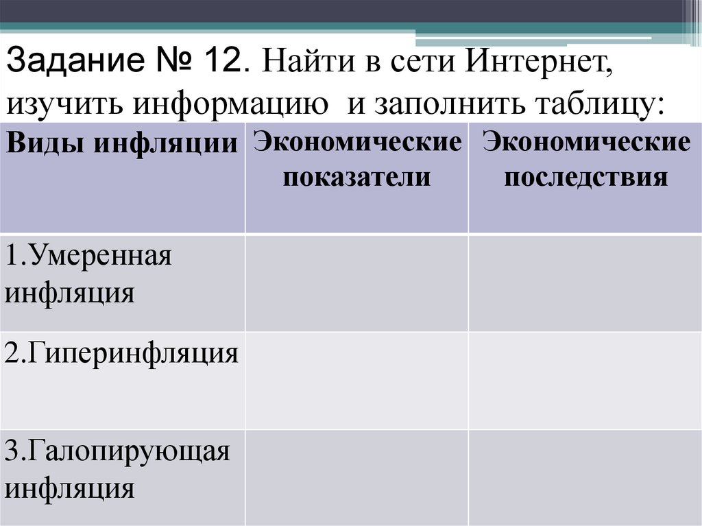 Задание № 12. Найти в сети Интернет,изучить информацию и заполнить таблицу: