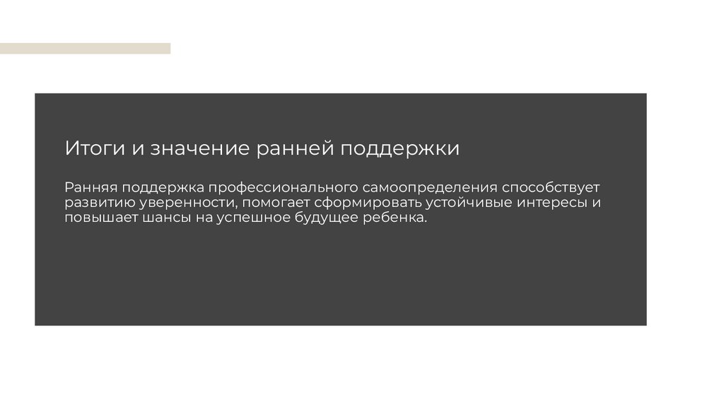 Итоги и значение ранней поддержкиРанняя поддержка профессионального самоопределения способствует