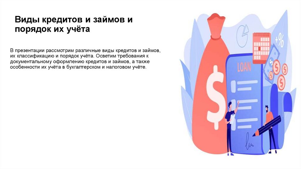 кредиты, государственные и коммерческие, в зависимости от организации-кредитора. Учёт каждого вида