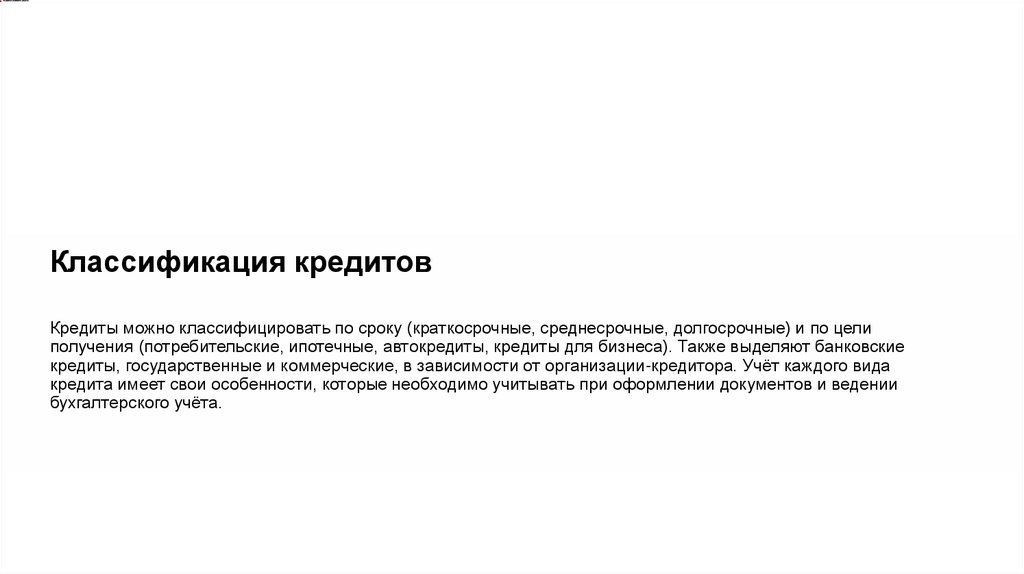 Классификация кредитовКредиты можно классифицировать по сроку (краткосрочные, среднесрочные, долгосрочные) и по цели