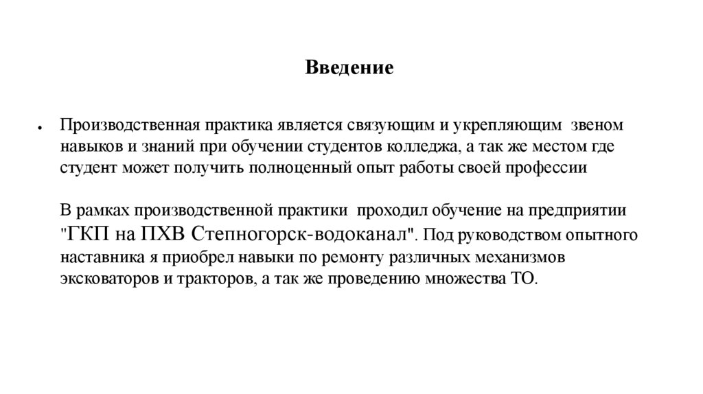 ВведениеПроизводственная практика является связующим и укрепляющим звеном