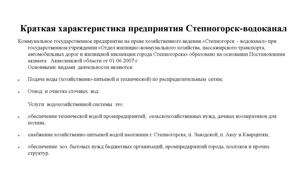 Краткая характеристика предприятия Степногорск-водоканалКоммунальное государственное предприятие на праве хозяйственного ведения «Степногорск – водоканал» при