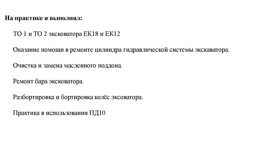 На практике я выполнял:ТО 1 и ТО 2 эксковатора ЕК18 и ЕК12