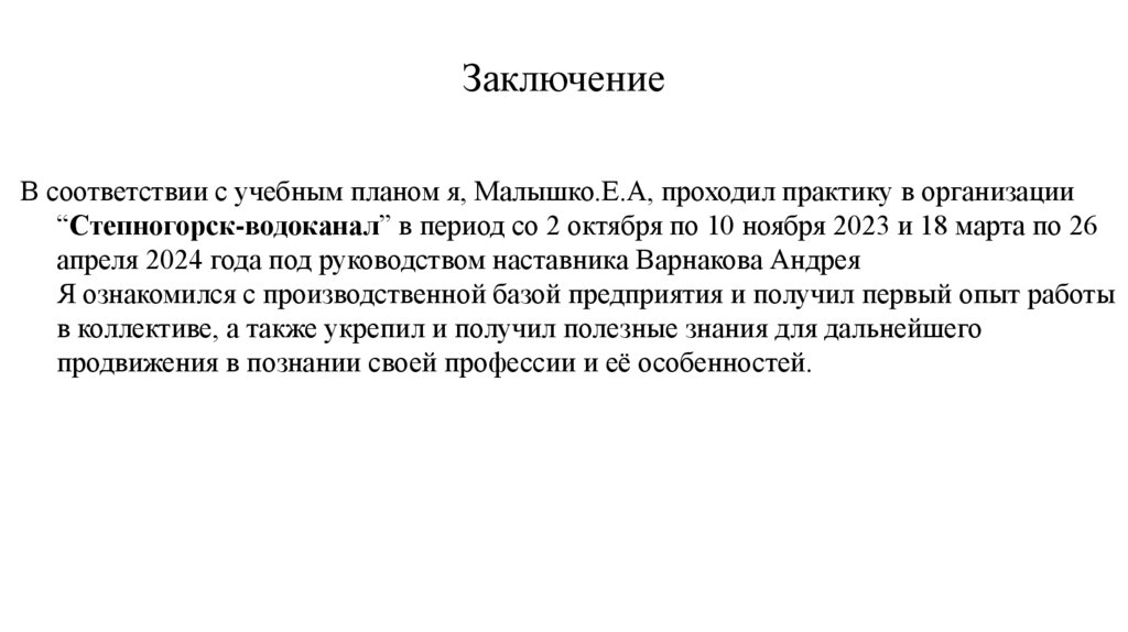 ЗаключениеВ соответствии с учебным планом я, Малышко.Е.А, проходил практику в организации