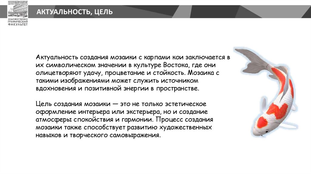 АКТУАЛЬНОСТЬ, ЦЕЛЬАктуальность создания мозаики с карпами кои заключается в