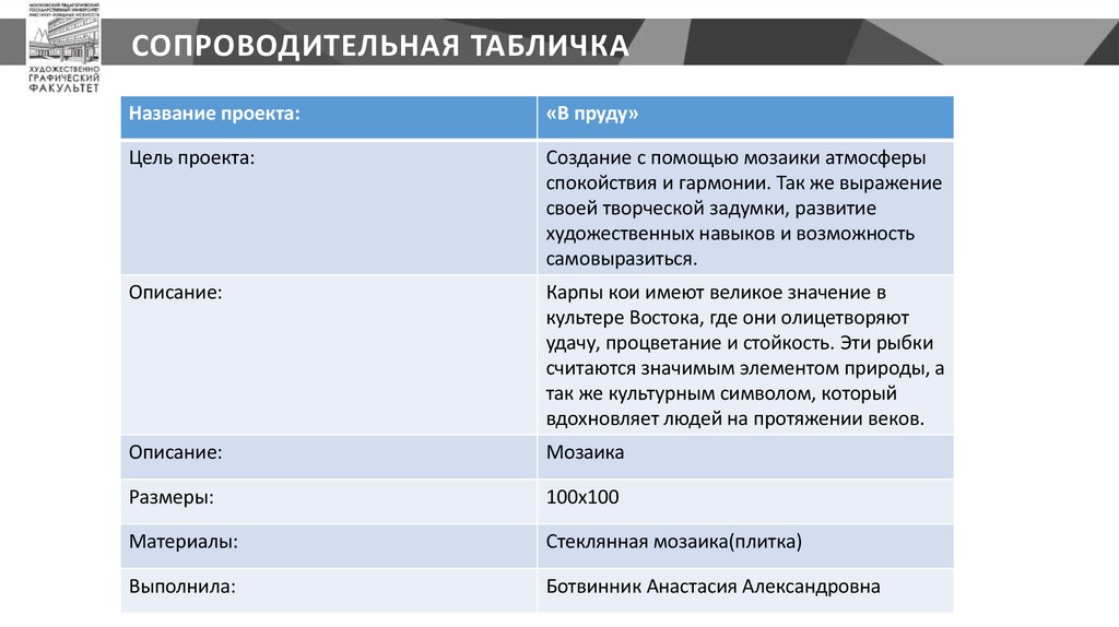 СОПРОВОДИТЕЛЬНАЯ ТАБЛИЧКАНазвание проекта: