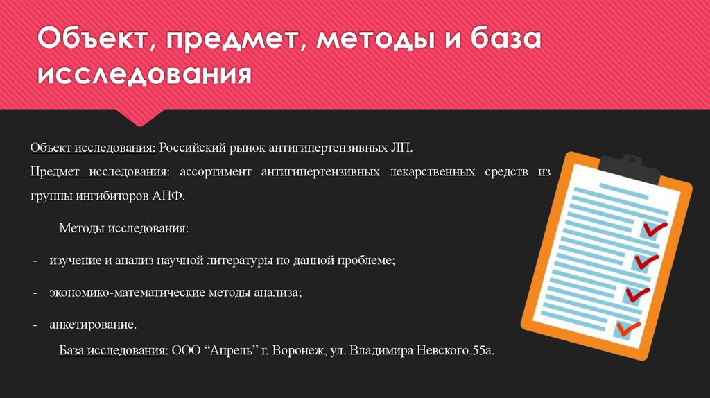 4. Объект, предмет, методы и база исследования