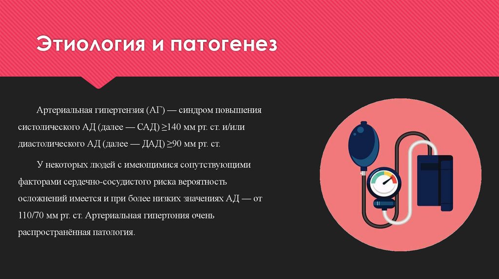Артериальная гипертензия (АГ) — синдром повышениясистолического АД (далее — САД) ≥140 мм рт. ст. и/или
