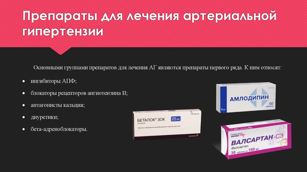 Основными группами препаратов для лечения АГ являются препараты первого ряда. К ним относят:ингибиторы АПФ;