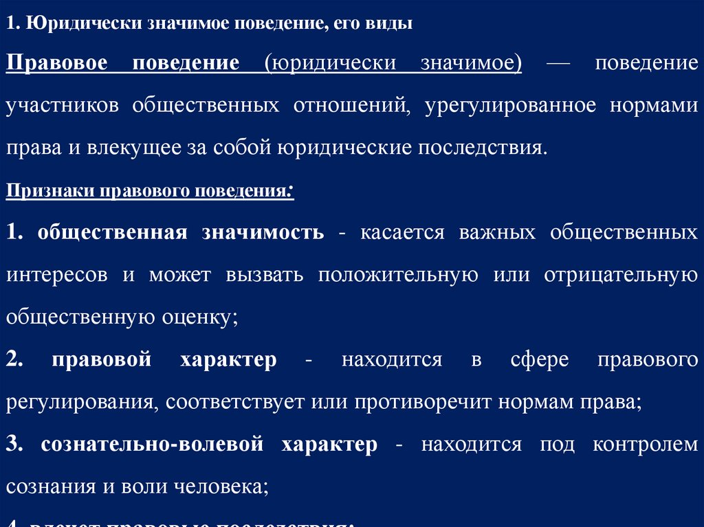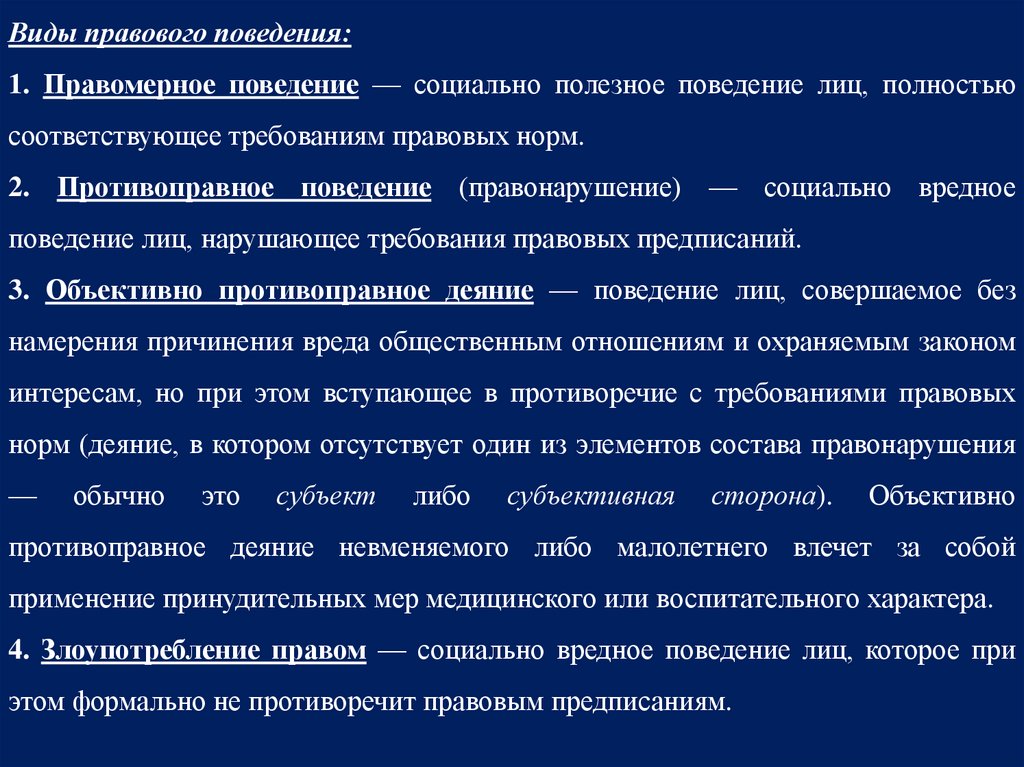 Виды правового поведения:1. Правомерное поведение — социально полезное поведение лиц, полностью
