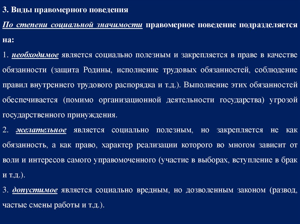 3. Виды правомерного поведенияПо степени социальной значимости правомерное поведение подразделяется