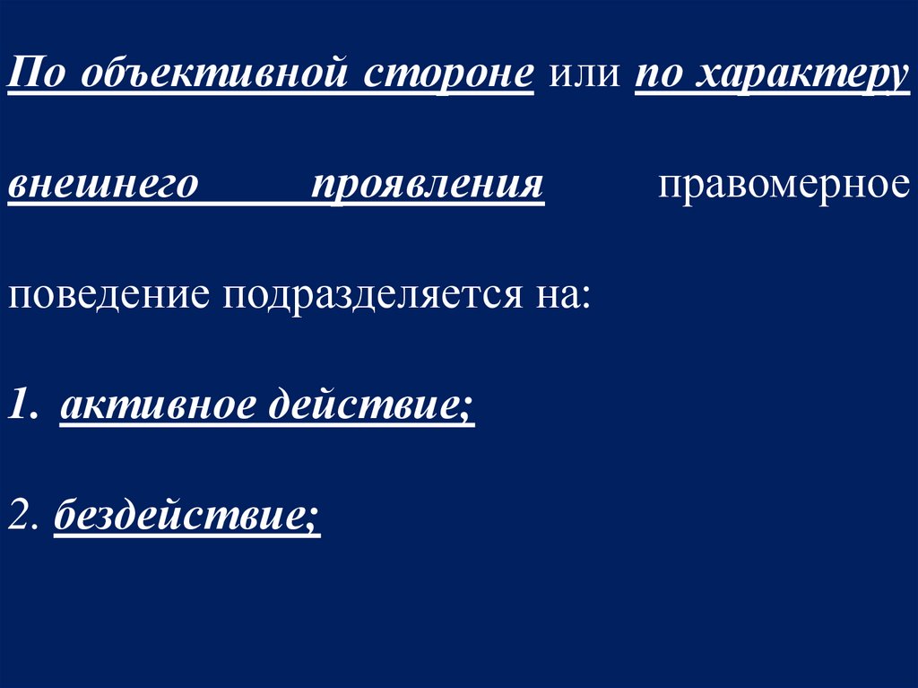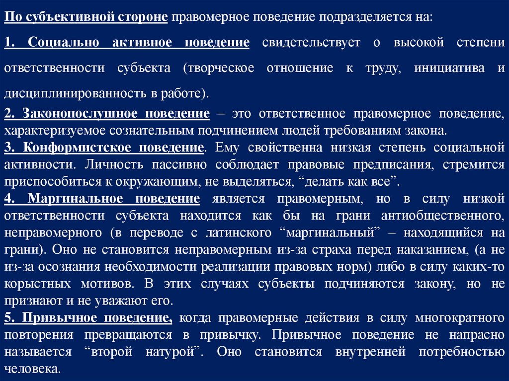 По субъективной стороне правомерное поведение подразделяется на:1. Социально активное поведение свидетельствует о высокой степени