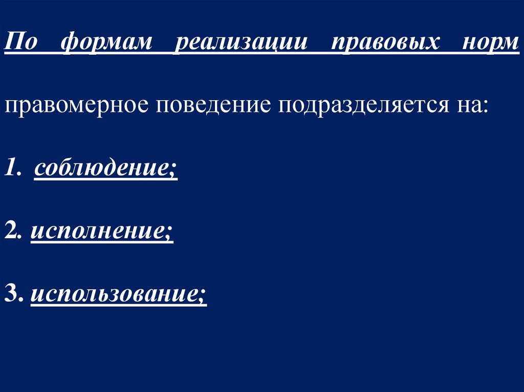 По формам реализации правовых нормправомерное поведение подразделяется на: