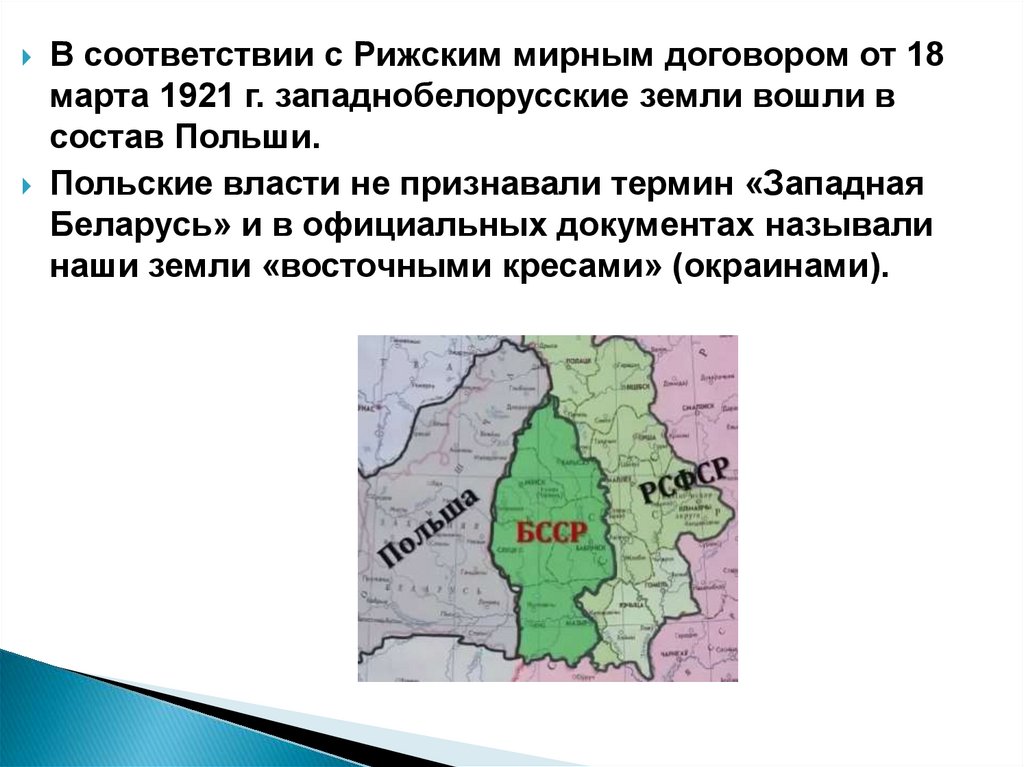 В соответствии с Рижским мирным договором от 18марта 1921 г. западнобелорусские земли вошли в