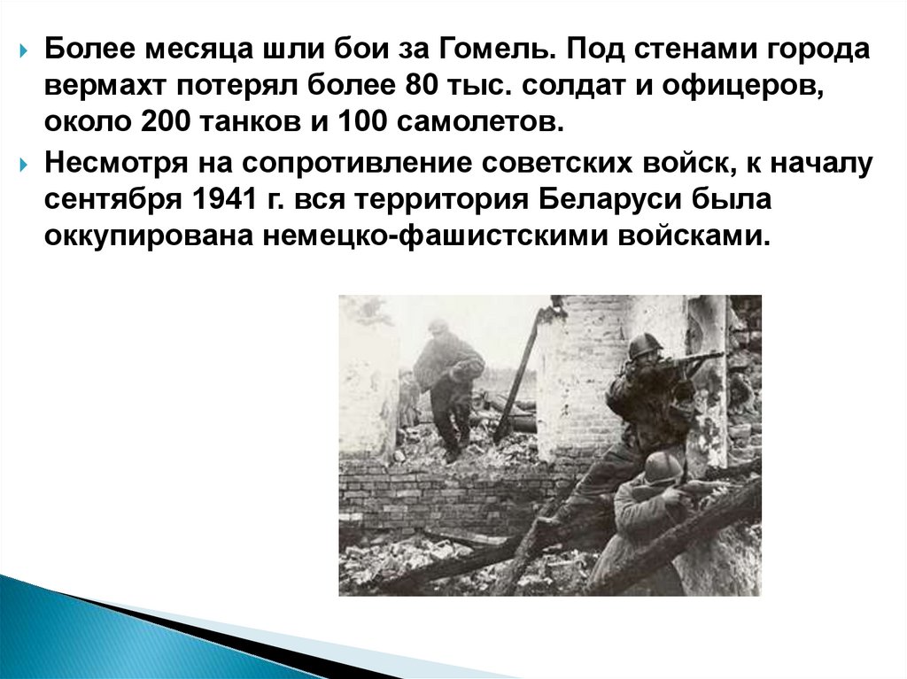 Более месяца шли бои за Гомель. Под стенами городавермахт потерял более 80 тыс. солдат и офицеров,