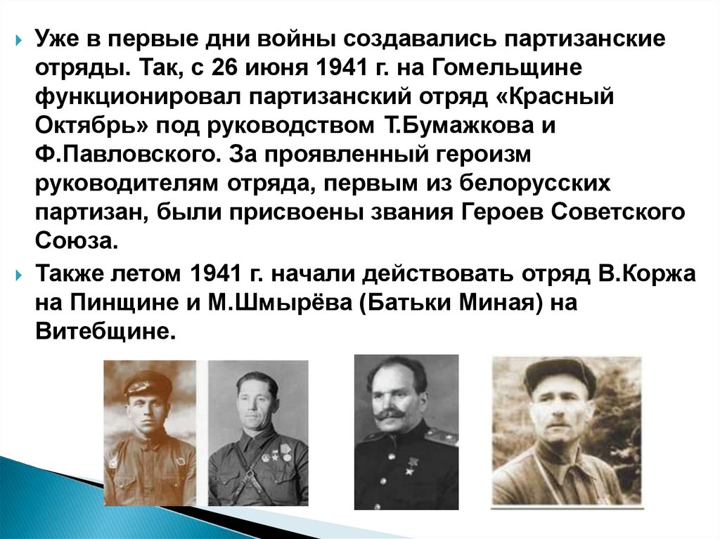 Уже в первые дни войны создавались партизанскиеотряды. Так, с 26 июня 1941 г. на Гомельщине