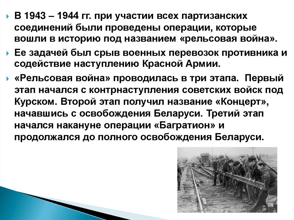 В 1943 – 1944 гг. при участии всех партизанскихсоединений были проведены операции, которые