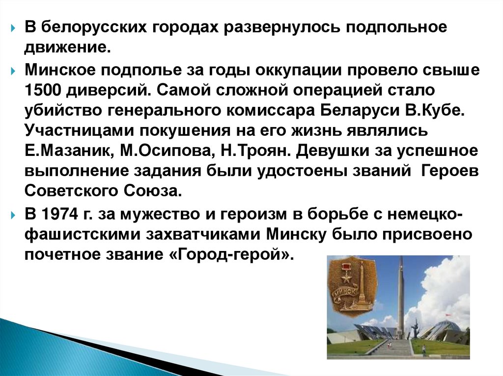В 1974 г. за мужество и героизм в борьбе с немецкофашистскими захватчиками Минску было присвоено