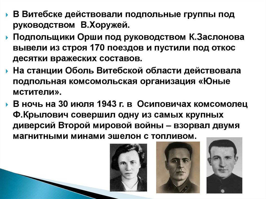 В Витебске действовали подпольные группы подруководством В.Хоружей.