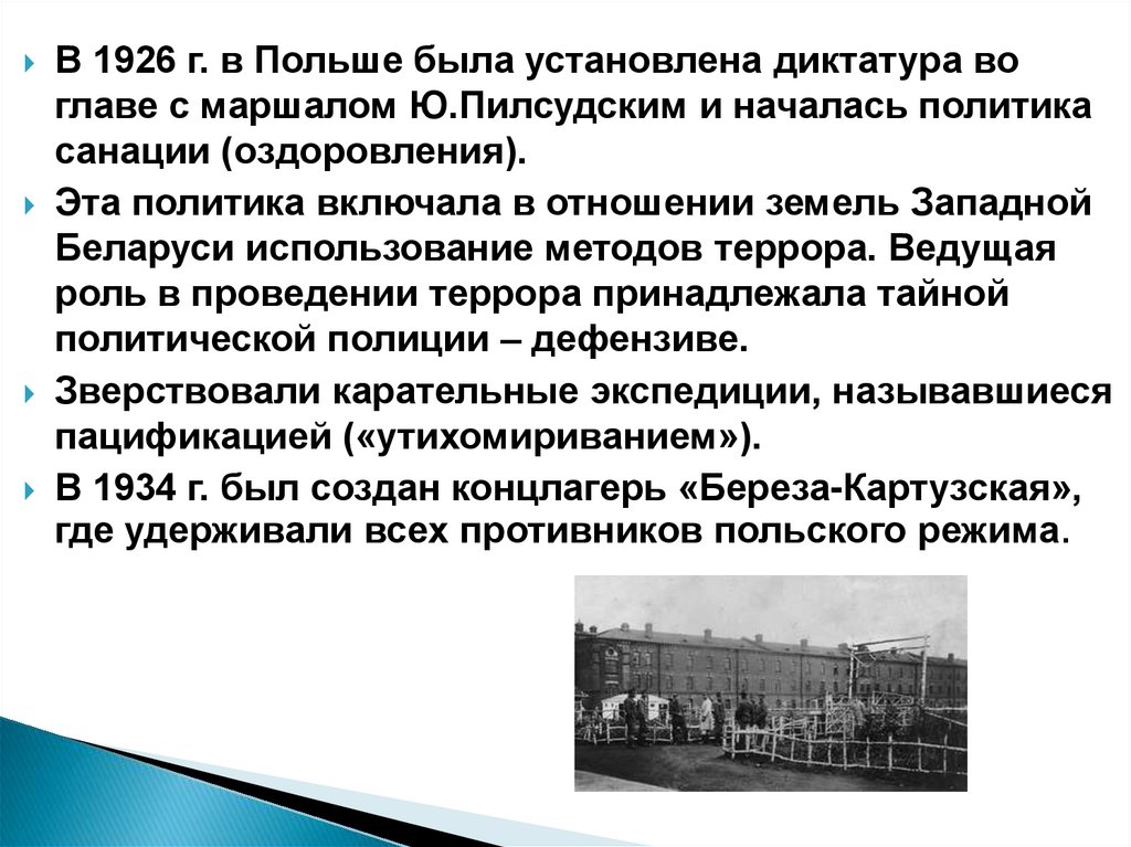 В 1926 г. в Польше была установлена диктатура воглаве с маршалом Ю.Пилсудским и началась политика
