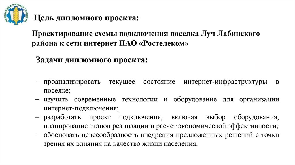Цель дипломного проекта:Проектирование схемы подключения поселка Луч Лабинского