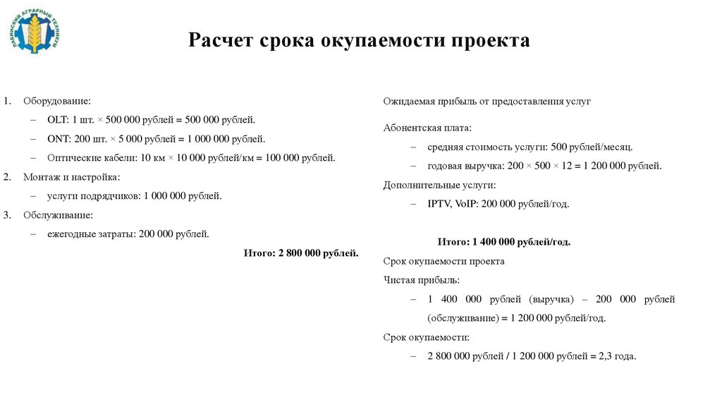 2 800 000 рублей / 1 200 000 рублей = 2,3 года.