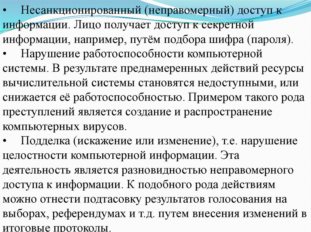 • Несанкционированный (неправомерный) доступ кинформации. Лицо получает доступ к секретной