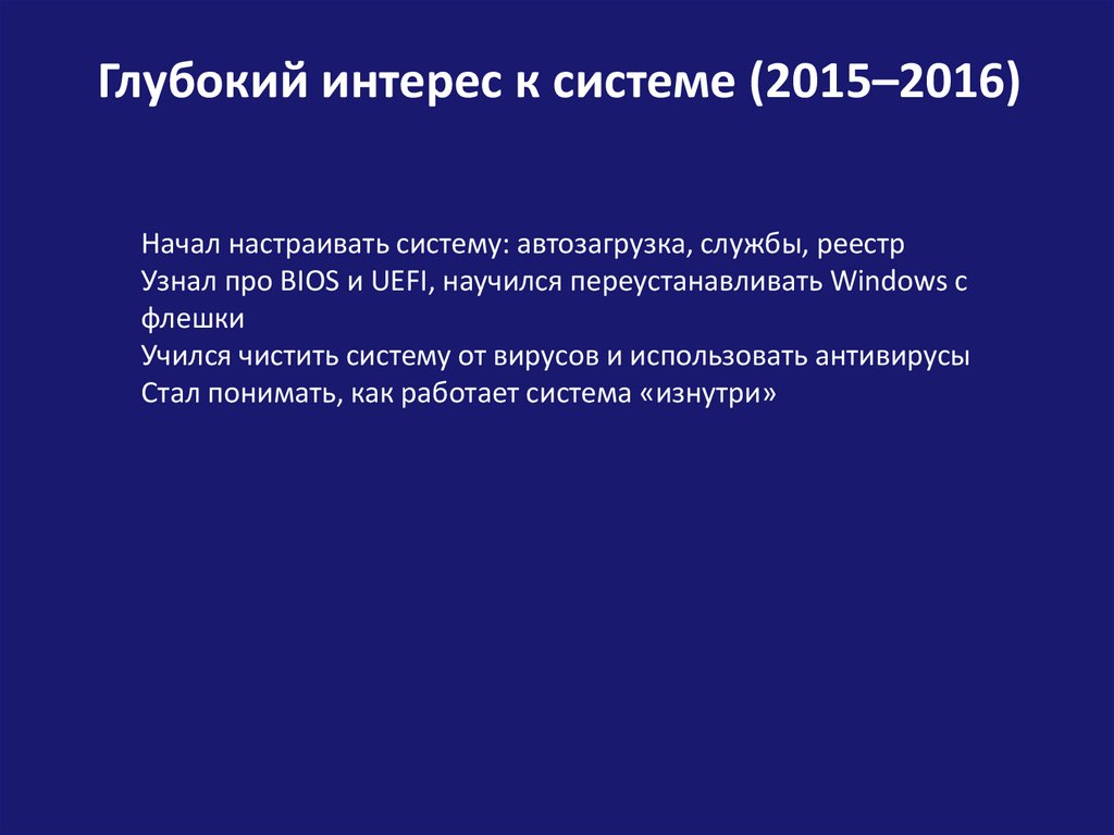 Глубокий интерес к системе (2015–2016)Начал настраивать систему: автозагрузка, службы, реестр