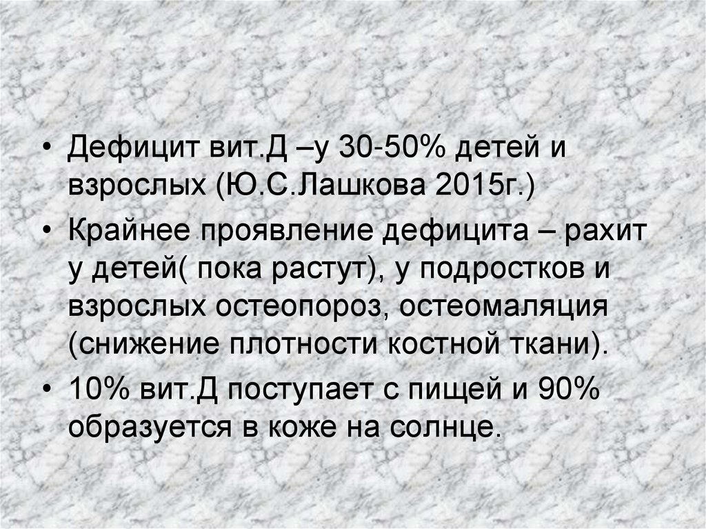 • Дефицит вит.Д –у 30-50% детей ивзрослых (Ю.С.Лашкова 2015г.)