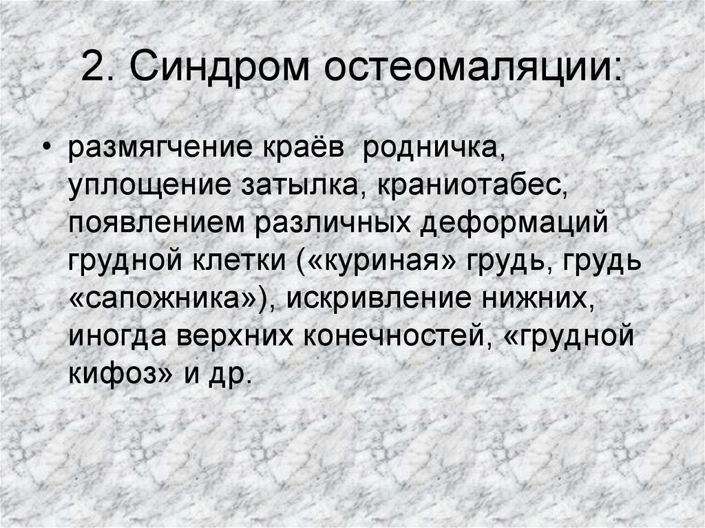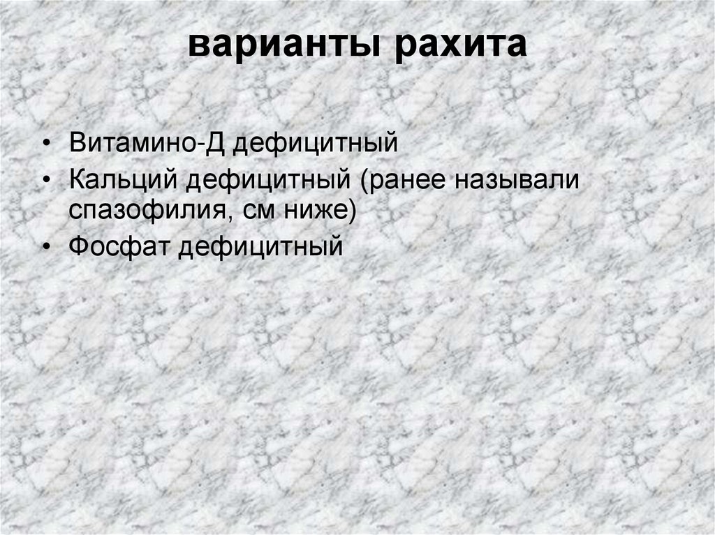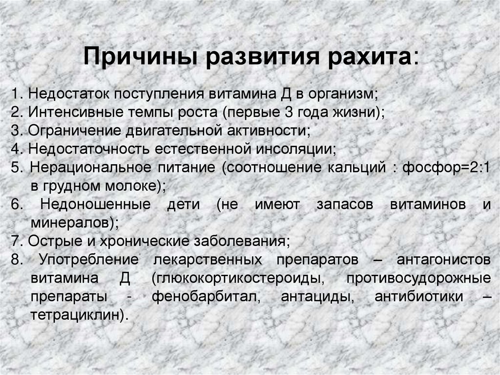 Причины развития рахита:1. Недостаток поступления витамина Д в организм;