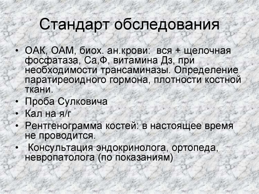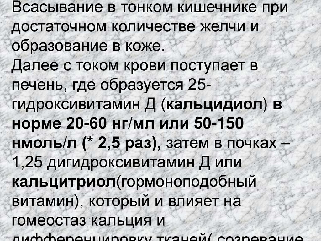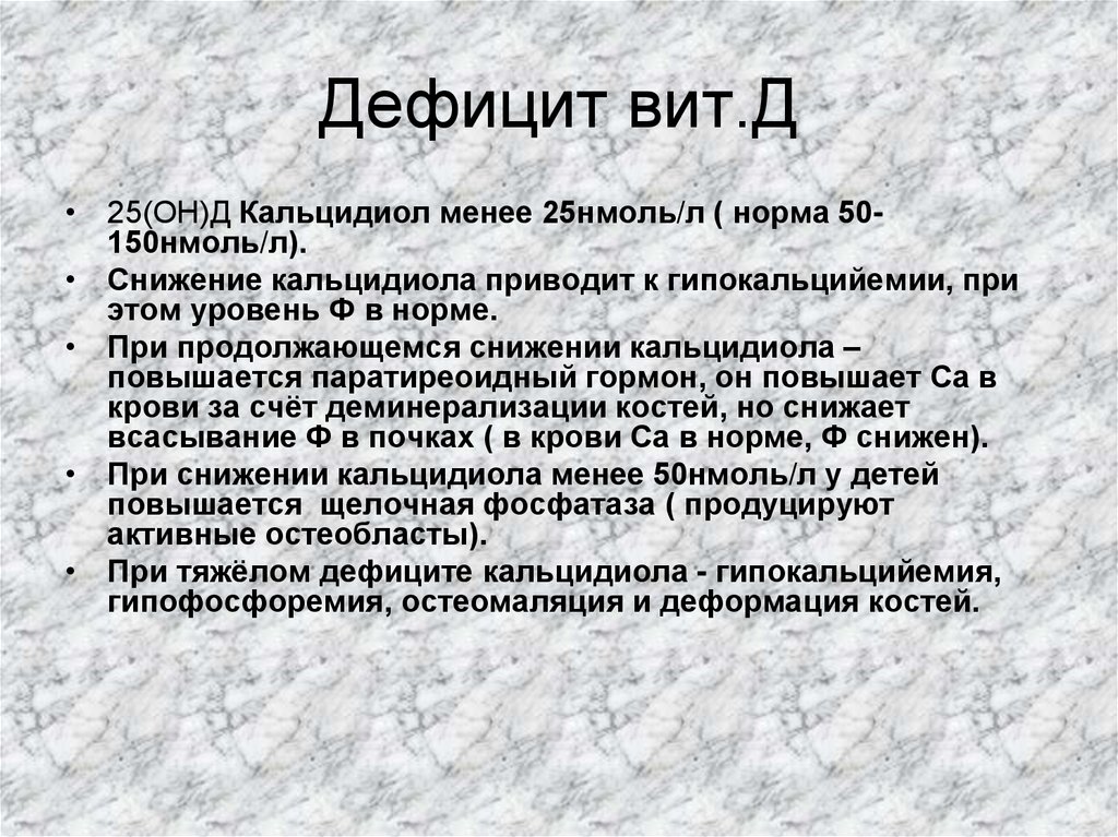 • 25(ОН)Д Кальцидиол менее 25нмоль/л ( норма 50150нмоль/л).• Снижение кальцидиола приводит к гипокальцийемии, при