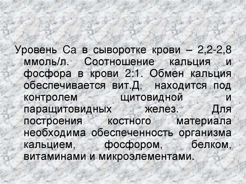 Уровень Ca в сыворотке крови – 2,2-2,8ммоль/л. Соотношение кальция и