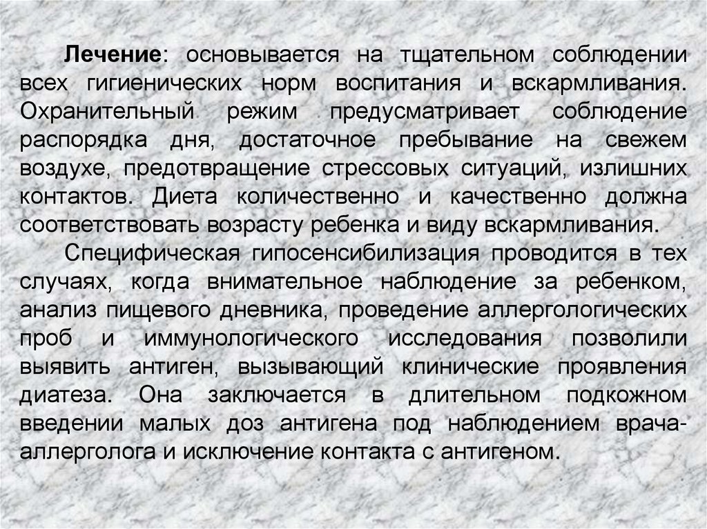 Лечение: основным методом лечения являютсярациональный режим и диета. Детей нужно оберегать от