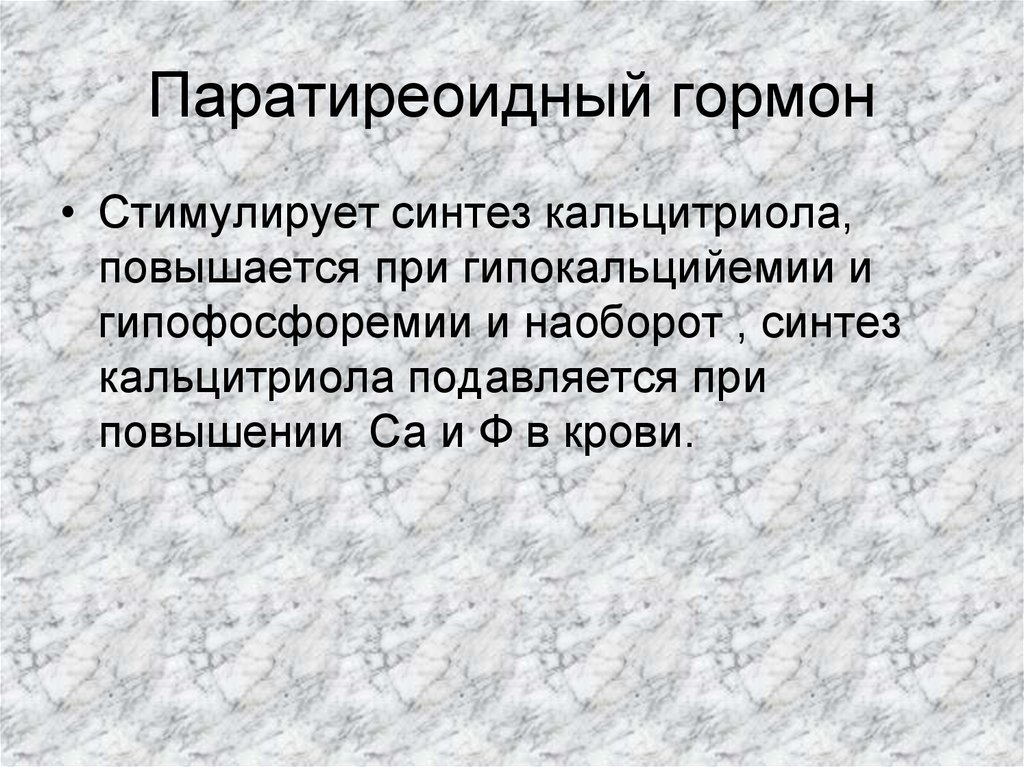 • Стимулирует синтез кальцитриола,повышается при гипокальцийемии и