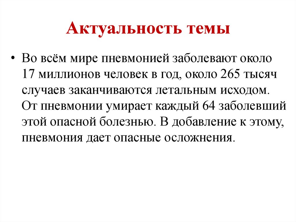 • Во всём мире пневмонией заболевают около17 миллионов человек в год, около 265 тысяч