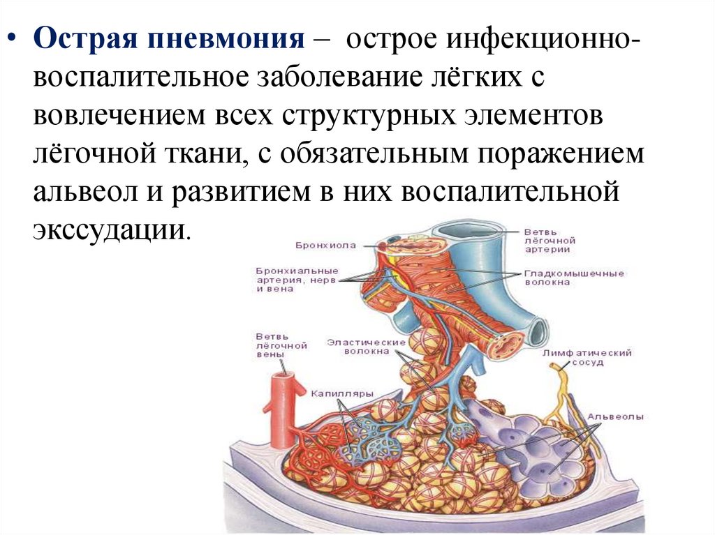 • Острая пневмония – острое инфекционновоспалительное заболевание лёгких свовлечением всех структурных элементов