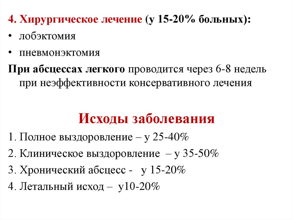 4. Хирургическое лечение (у 15-20% больных):• лобэктомия