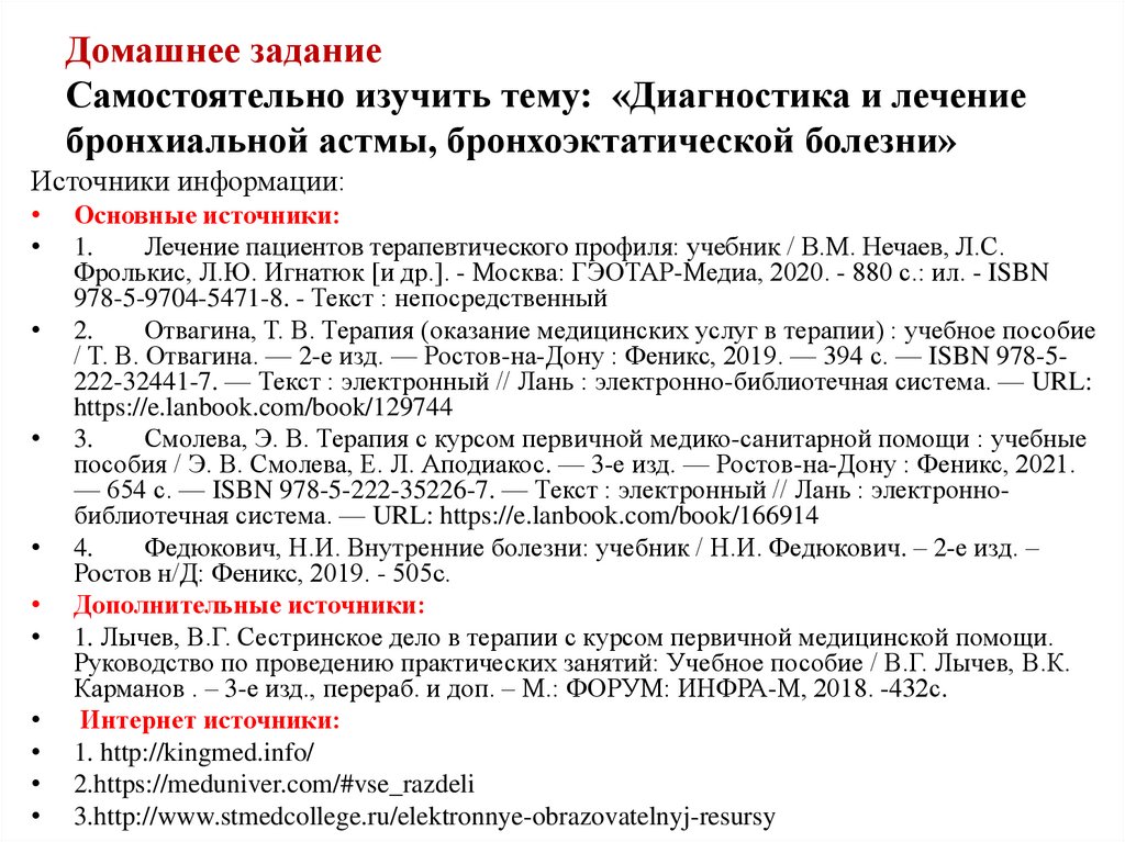 60. Домашнее задание Самостоятельно изучить тему: «Диагностика и лечение бронхиальной астмы, бронхоэктатической болезни»